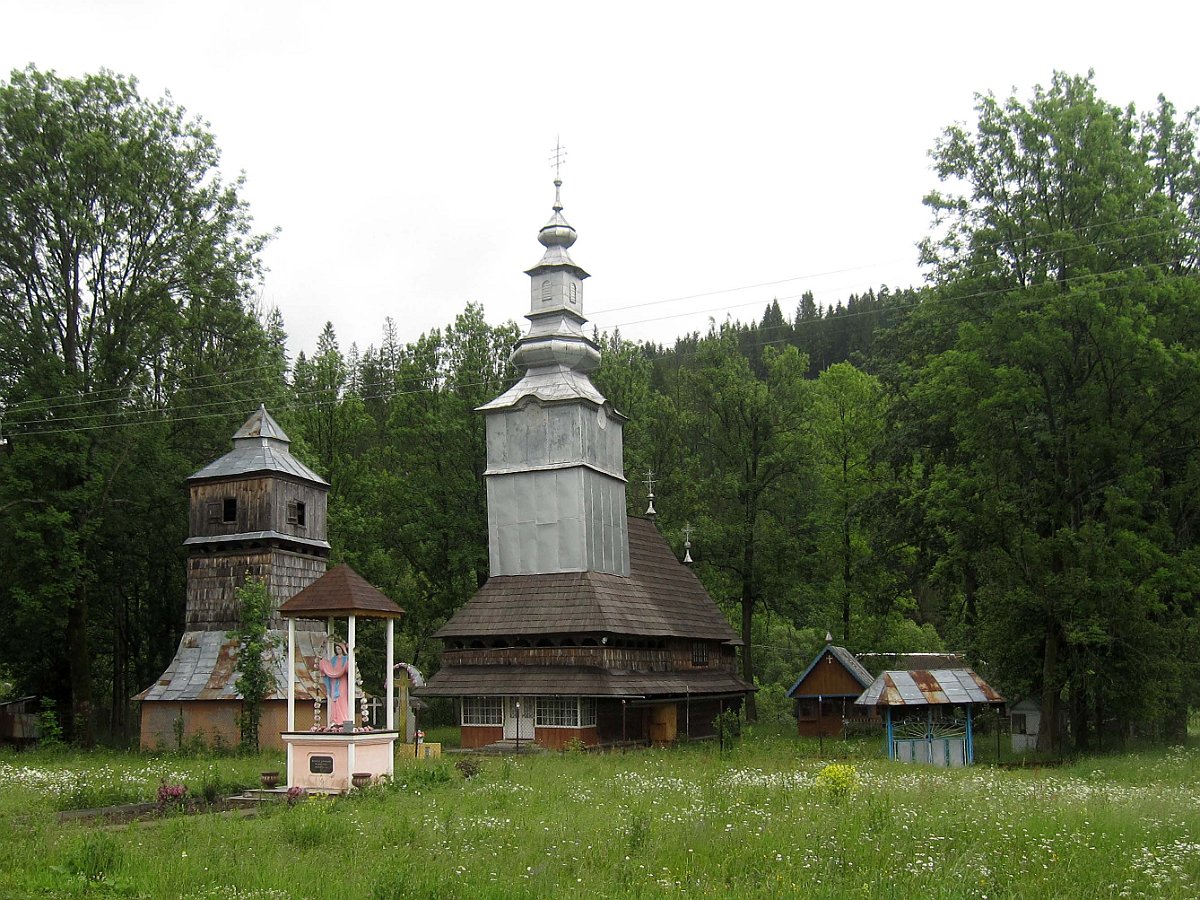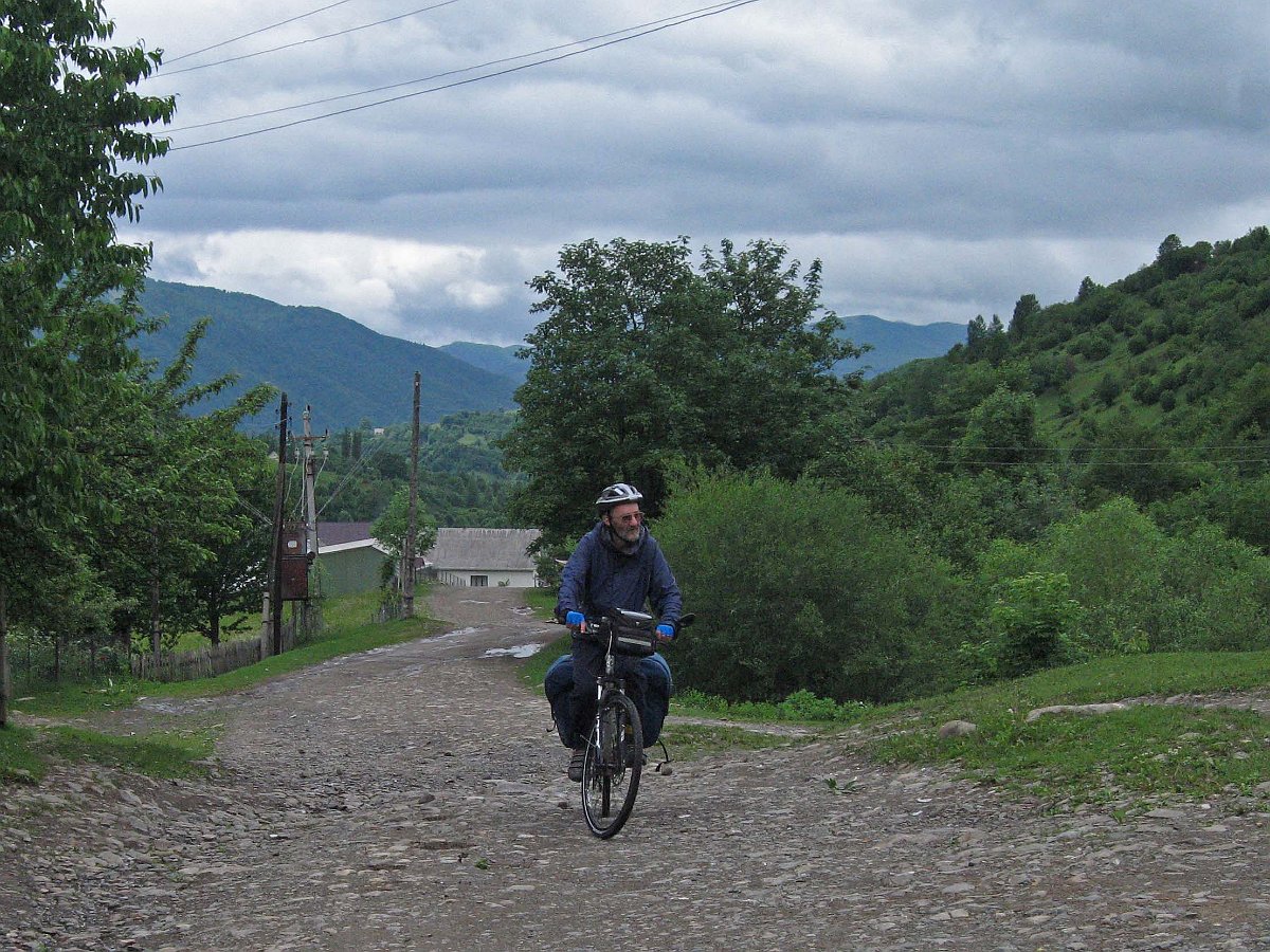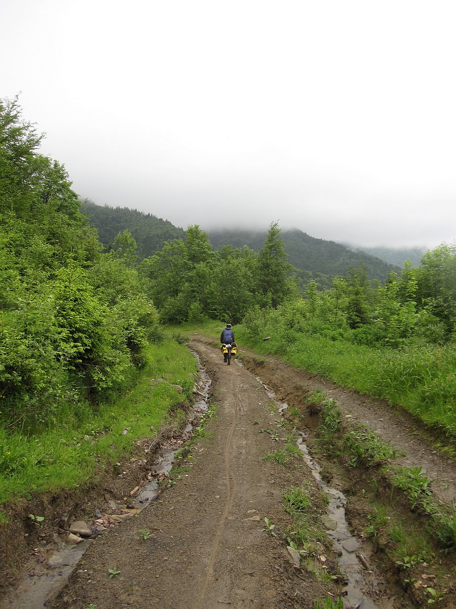 Około siódmej przestało lać i tylko tak sobie kropiło. Ruszamy. Dzisiaj czeka nas kilka dolin pomniejszych rzek oraz trzy przełęcze. Droga cały czas przebiegać będzie granicą między pasmami górskimi: po lewej Bieszczady Wschodnie, potem Gorgany, po prawej Borżawa, potem Krasna. Celem jest Ust Czorna, czyli przed nami jakieś 130 km. Jedziemy nie spiesząc się ale i nie przystając na dłużej. Pogoda jest małofotograficzna. Aparat wyciągamy rzadko, nawet nie pamiętam, skąd pochodzą cztery pierwsze zdjęcia. Pierwsza przełęcz ma wysokość ponad 700 metrów, potem zjazd do Miżgirii. Następnie przełęcz ponad 900 metrów, zjazd do Synewiru, Negrowiec, w końcu Kołczawa.