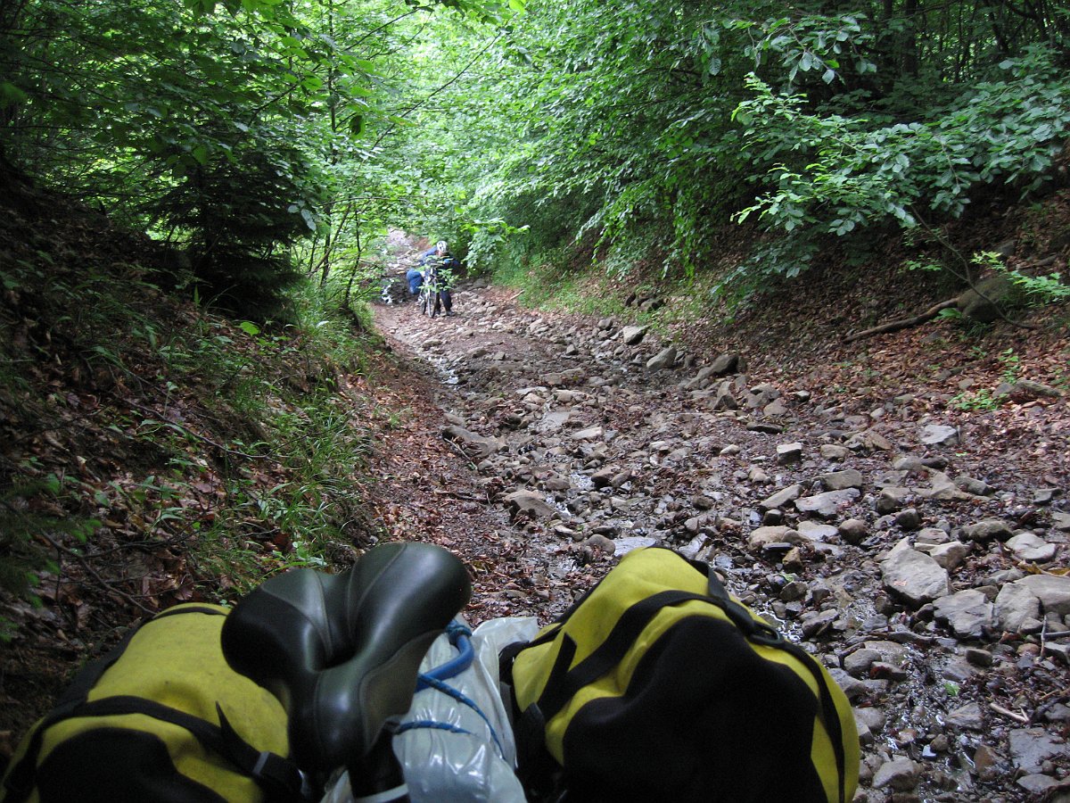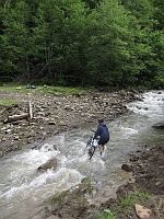 Później przenosimy we dwóch każdy rower bez odpinania sakw. W płytszych miejscach da się przejść z rowerem w pojedynkę. W końcu docieramy szczęśliwie do Niemieckiej Mokrej, myjemy buty, spodnie, nogi i skarpety w Mokrance i prawdziwą drogą zjeżdżamy w do Ruskiej Mokrej i Ust Czornej.
