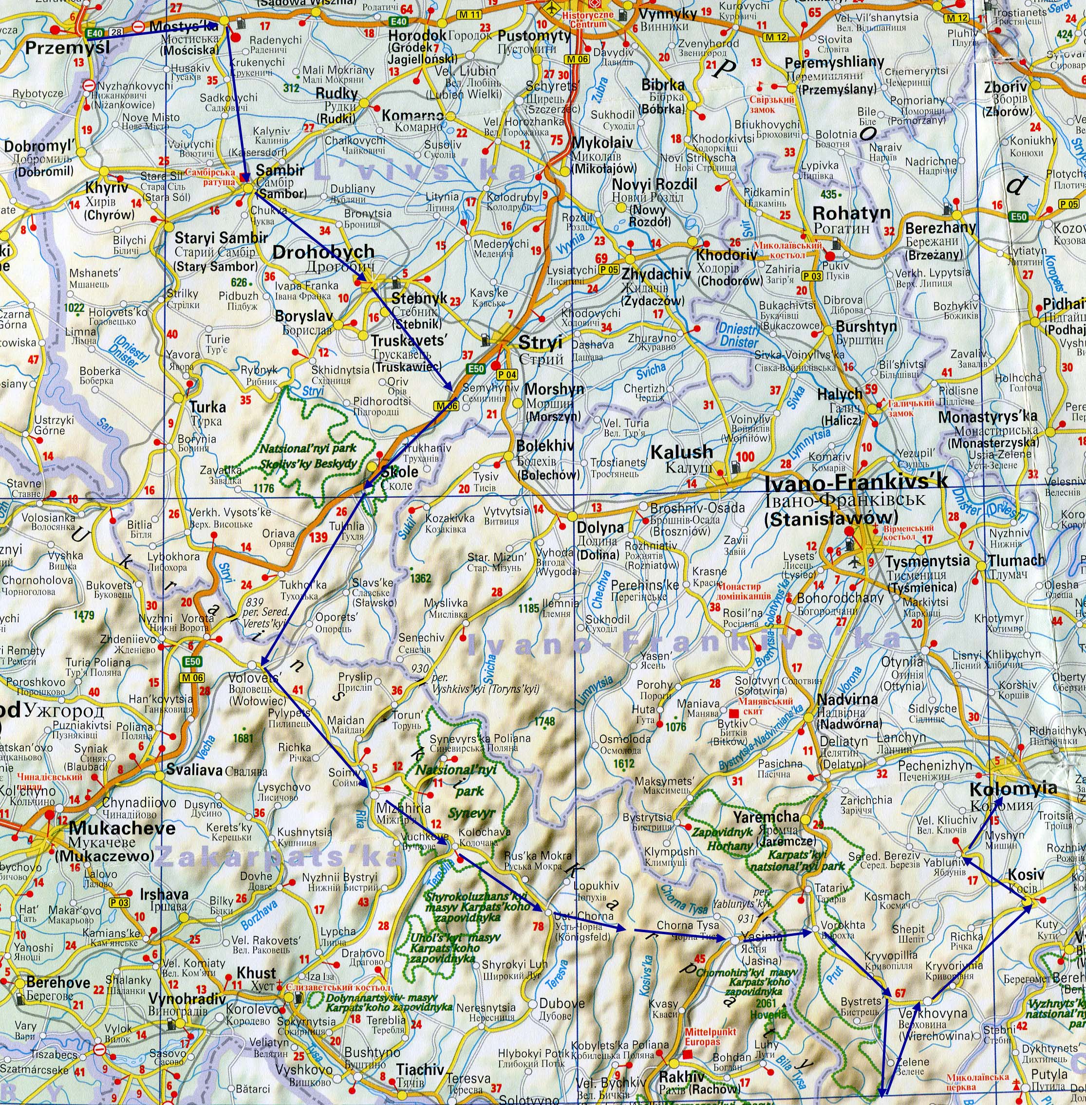 Szkic całej trasy: Przemysl-Kolomyja-trasa.jpg Ślady z poszczególnych dni wędrówki na mapach: UMP gpies.com Dzień 1. Przemyśl - Medyka - Mościska - Sambor - Drohobycz - Lubieńce - Ławoczne (na odcinku Lubieńce-Ławoczne przejazd pociągiem) UMP gpies.com Dzień 2. Ławoczne - Wołowiec - Miżgiria - Synewir - Kołczawa - Niemiecka Mokra - Ust Czorna (na odcinku Ławoczne-Wołowiec przejazd pociągiem) UMP gpies.com Dzień 3. Ust Czorna - Łopuchow - Jabłunica - g. Berlaska - g. Pidpula - g. Ungariaska - g. Trojaska - jeziorko Apszyniec (biwak) UMP gpies.com Dzień 4. jeziorko Apszyniec - g. Geriszaska - grzbiet Apszyniec - g. Stoh - Dragobrat - Jasinia (nocleg w schronisku Edelweis) UMP gpies.com Dzień 5. Jasinia - Łazeszczyna - Woronienko - Worochta - Ilcia - Bystrec - Zełene - Szybene (nocleg u mieszkańców) UMP gpies.com Dzień 6. Szybene - Żabie - Krzyworównia - Jasionów - Uścieryki - Wyżnica - Stare Kuty (nocleg) UMP gpies.com Dzień 7. Stare Kuty - Kosów - Kołomyja - Stanisławów - Lwów - Mościska - Przemyśl - Jarosław (od Kołomyi pociagiem) |