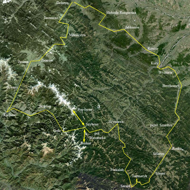 Jak widać z mapki u dołu strony, nasze „dookoła Czrnohory” zostało rozszerzone o Góry Pokucko-Bukowińskie, Połoniny Hryniawskie i kawałek Gór Czywczyńskich.